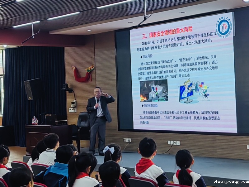 社会与公共管理学院副院长陈丰教授走进上海市黄浦区卢湾一中心小学进行线下讲座,围绕“坚持总体国家安全观,筑牢新时代安全防线”主题进行宣讲。他从国家安全观的定义出发,介绍了总体国家安全观的新形势新变化,并深入分析了变化背后国际化进程推进、企业走出去的需求等内在动因。他指出,党的二十大报告提出推进国家安全体系和能力现代化,而安全是发展的前提,发展是安全的保障,我国综合国力增强,和发达国家差距缩小,正处于社会转型过程中的中国,各种矛盾和挑战很多,重大风险面广点多,防控形势严峻,因而更应提高国家安全意识,采取积极行动,筑牢我国的安全防线。