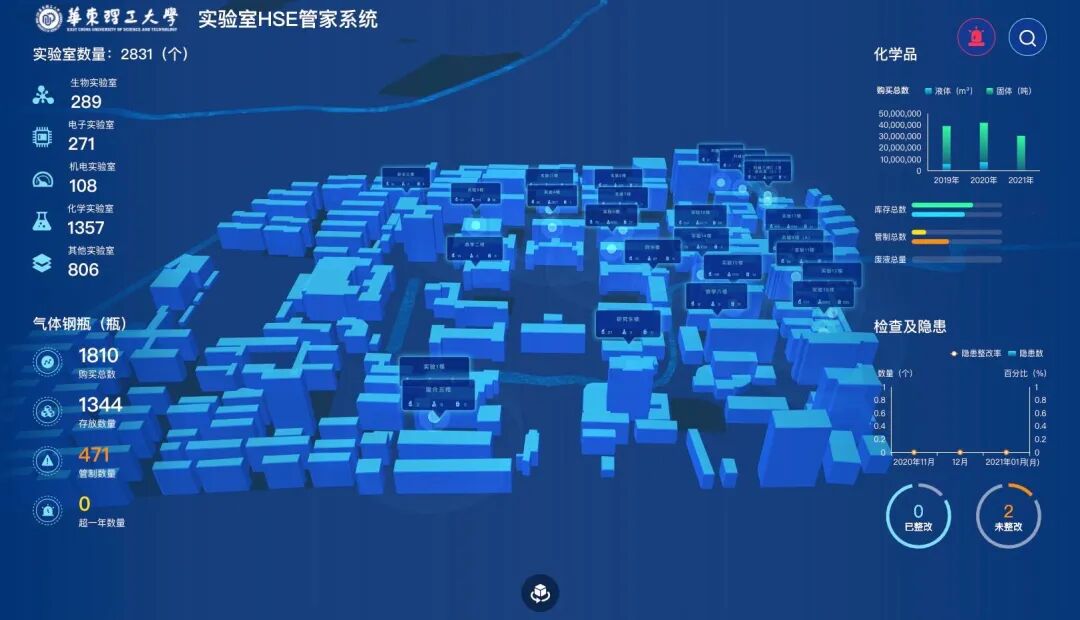 为深入学习贯彻习近平总书记关于安全生产重要论述,在学校党政领导及各部门、学院大力支持下,csgo雷竞技实验室与装备处(安全办)建立了实验室HSE管家系统,成为全国首家借助信息化手段进行全品类化学品、钢瓶动态风险管理的高校,借助存储禁忌等风险数据库,实现了“一瓶一码一人一台账”的精细管理,进一步提升了华理化学品及钢瓶的使用效率,借助大数据做到了固有风险源的分类分级管控,为学校“双一流”建设和内涵式发展提供坚实基础和澎湃动力。