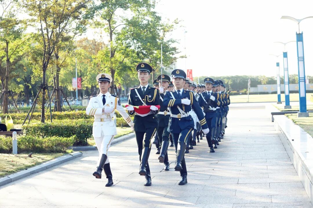 伴着雄壮国歌,迎着旭日朝升,五星红旗冉冉升起,在场师生向国旗行注目礼,表达对祖国的无限热爱和崇高敬意。
